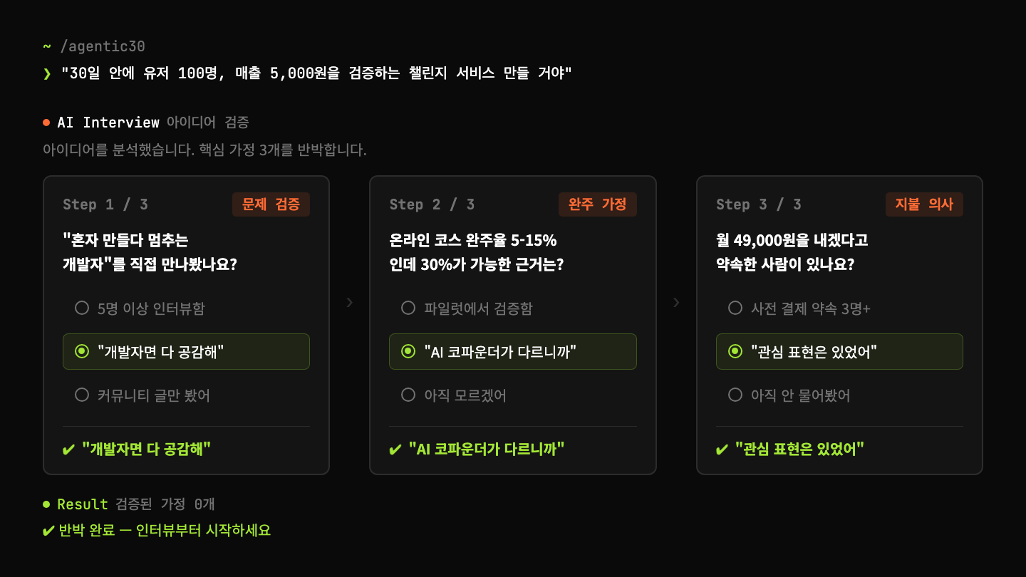 - Agentic30은 제품을 만들기 전에 인터뷰로 문제를 검증하는 실험입니다.