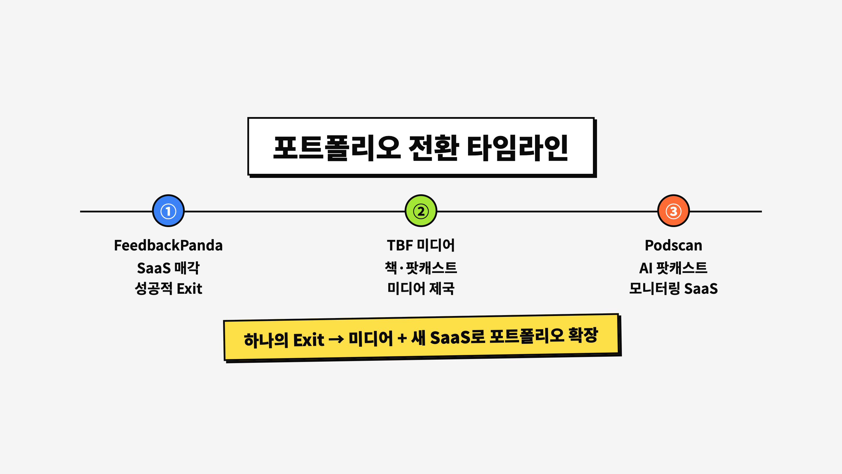 - 매각 후 The Bootstrapped Founder로 전환해 책 2권, 주간 뉴스레터, tbf.fm 사람 페이지 기준 436회 출연/진행 이력이 있는 팟캐스트를 운영하고 있습니다.