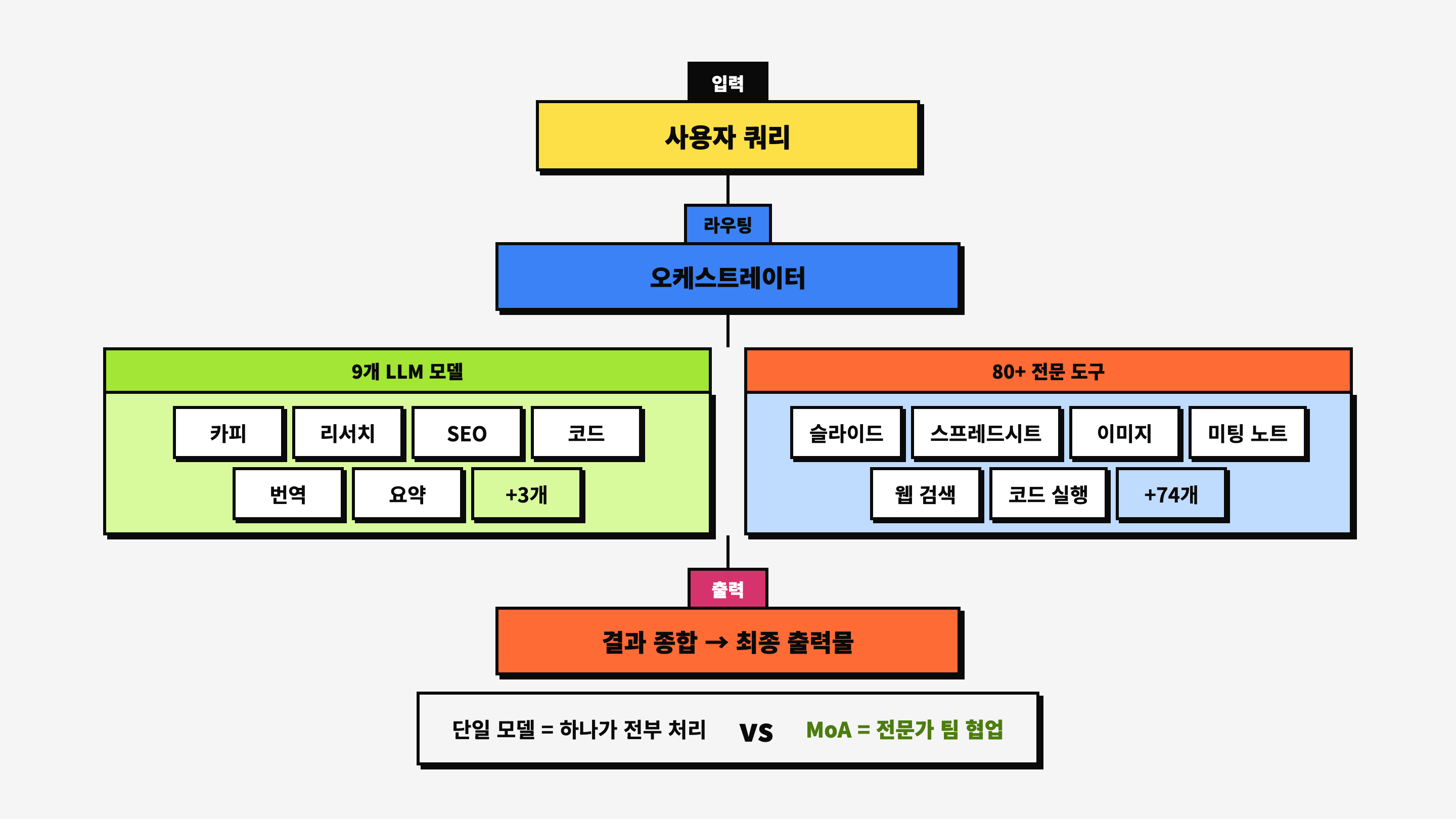 Genspark는 다르다. 9개 LLM + 80개 이상의 전문 도구가 협업한다. 쿼리가 들어오면 어떤 모델과 도구가 이 작업에 적합한지 라우팅하고, 각 에이전트의 출력을 종합해 결과를 만든다. 이게 Mixture-of-Agents(MoA) 방식이다.