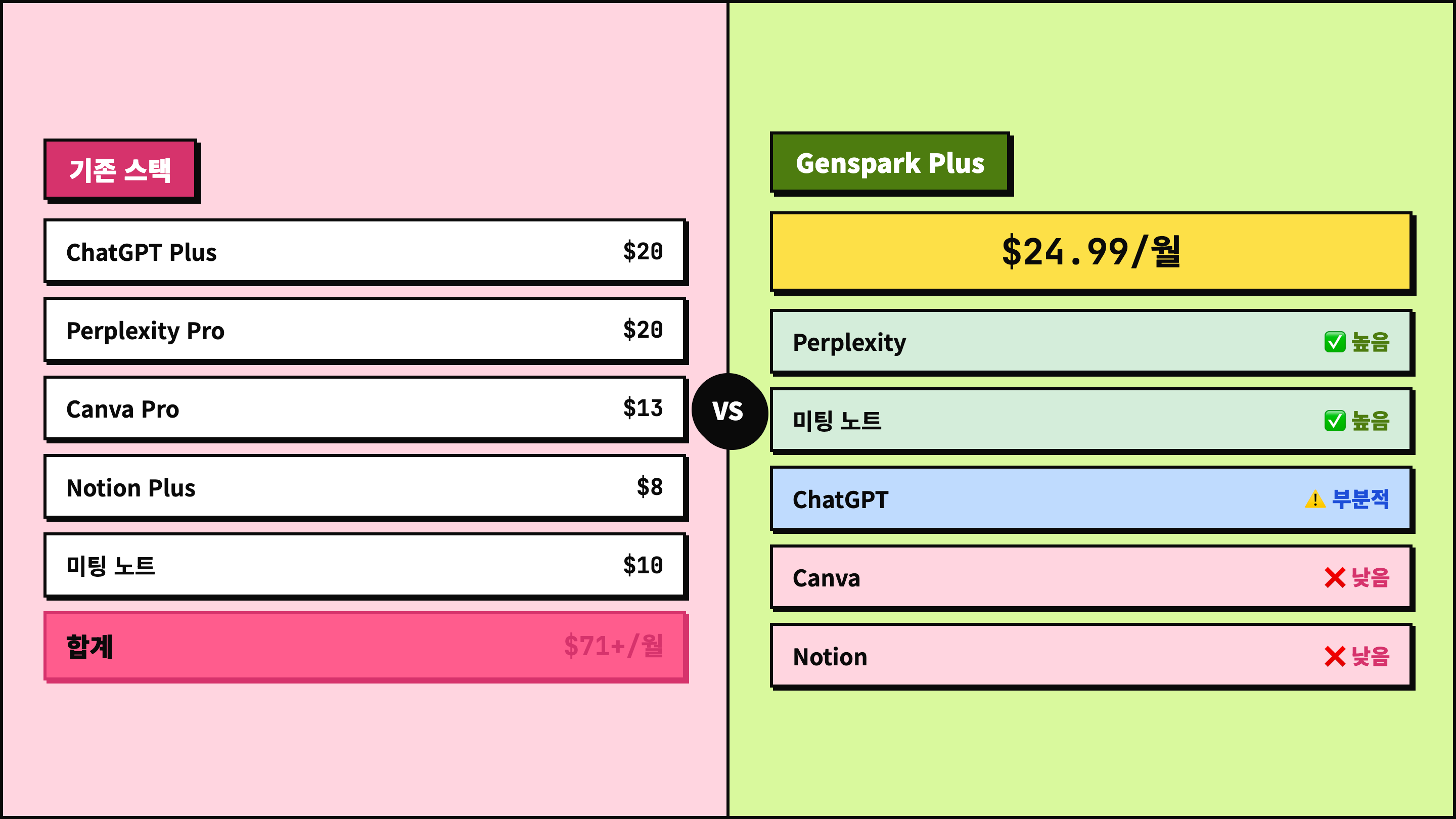 | 항목 | ChatGPT Plus ($20/월) | Genspark Plus ($24.99/월) |