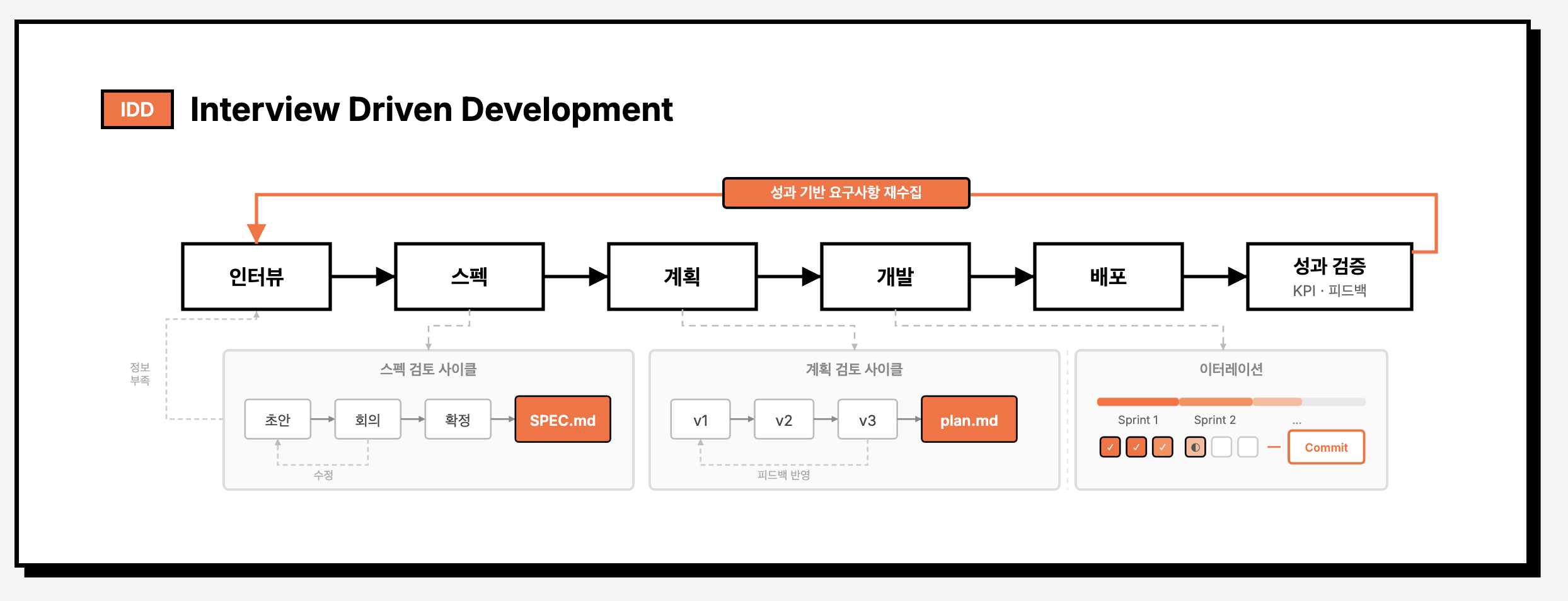 IDD는 인터뷰 → 스펙 → 계획 → 개발 → 배포 → 성과 검증의 순환 구조를 가집니다.