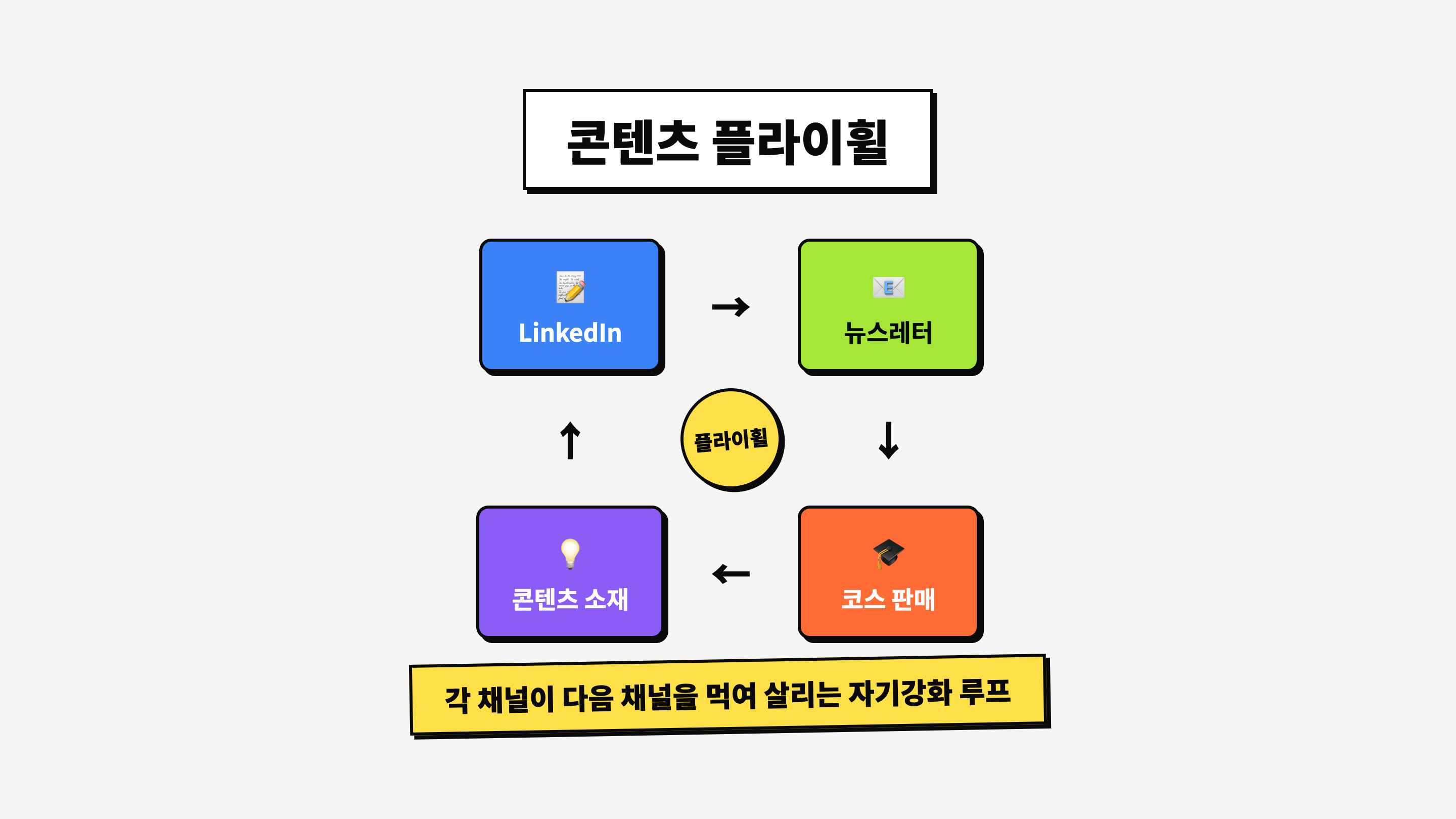 LinkedIn에서 "관심"을 만들고, 뉴스레터에서 "신뢰"를 쌓고, 코스에서 "전환"합니다. 세 단계가 명확하게 분리되어 있습니다.