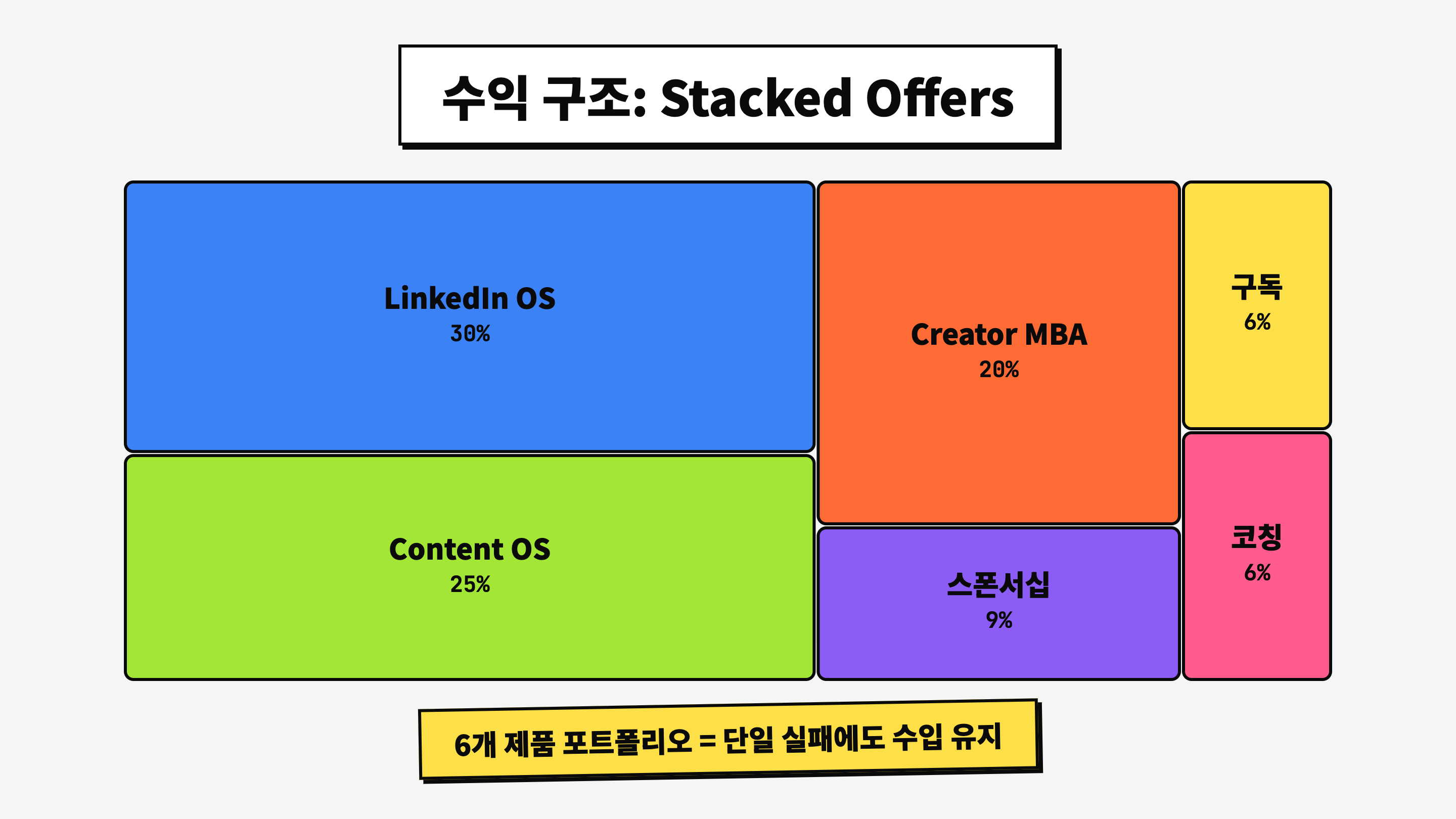 - LinkedIn 공개 프로필 기준 836K 팔로워, 뉴스레터는 공식 홈페이지 기준 175K+ 독자를 기반으로 디지털 프로덕트(코스 3종 + 구독)를 판매합니다. 이익률은 공개 프로필 기준 약 86%
