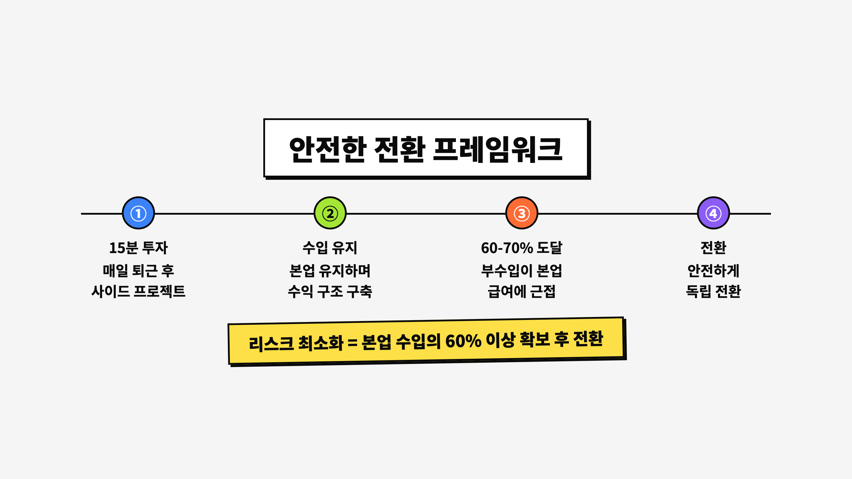 직장을 다니면서 하루 15분씩 자기 채널을 키우세요. 사이드 수입이 연봉의 60~70%에 도달할 때까지 전환하지 마세요.