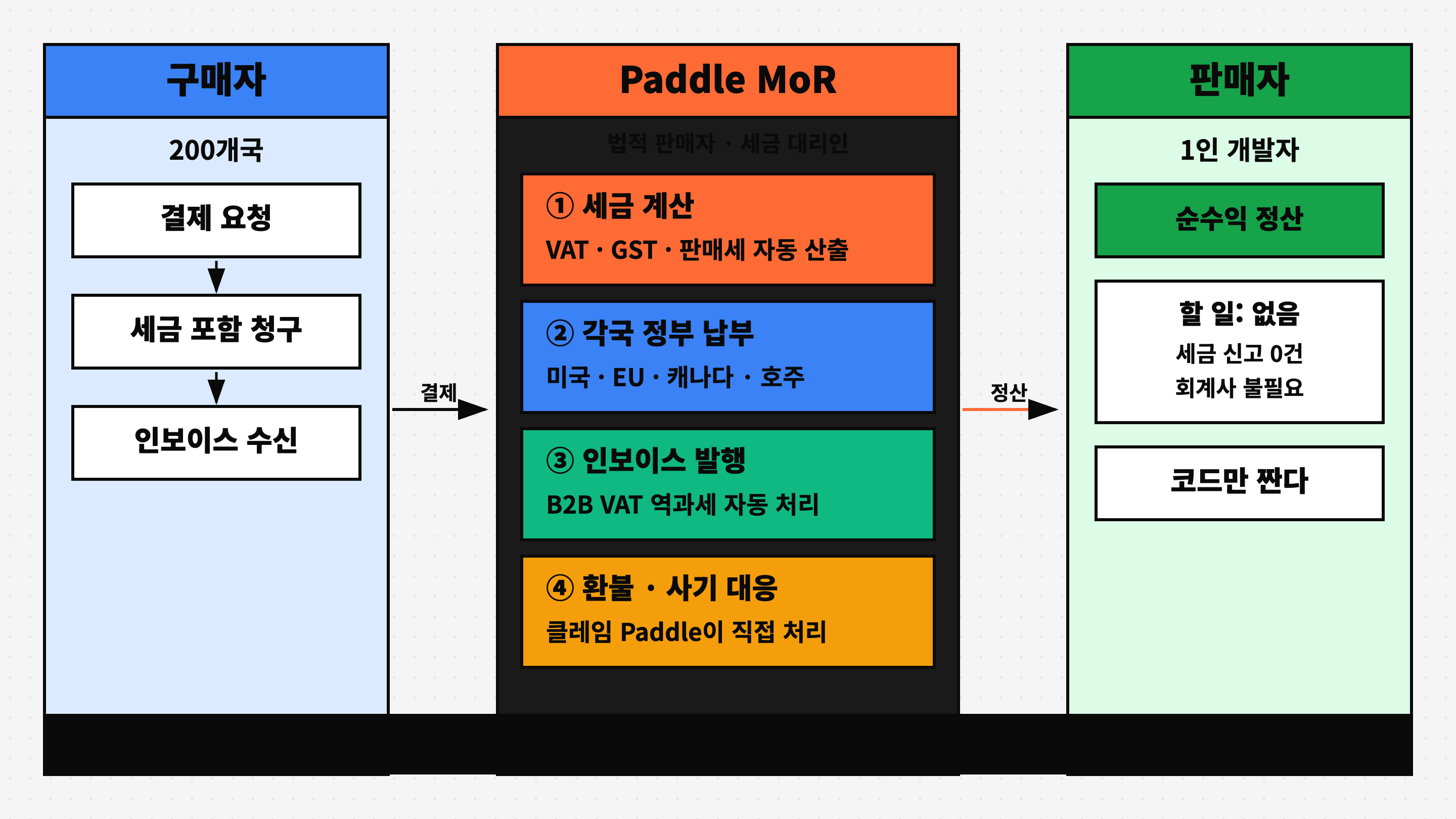 MoR은 다르다. Paddle이 법적 판매자가 된다. 고객 입장에서 영수증에 찍히는 회사가 Paddle이다. 판매세와 VAT를 Paddle이 계산하고 각국 정부에 직접 납부한다. 환불 클레임이 오면 Paddle이 처리한다. 1인 개발자는 그냥 Paddle에서 정산금을 받으면 된다.