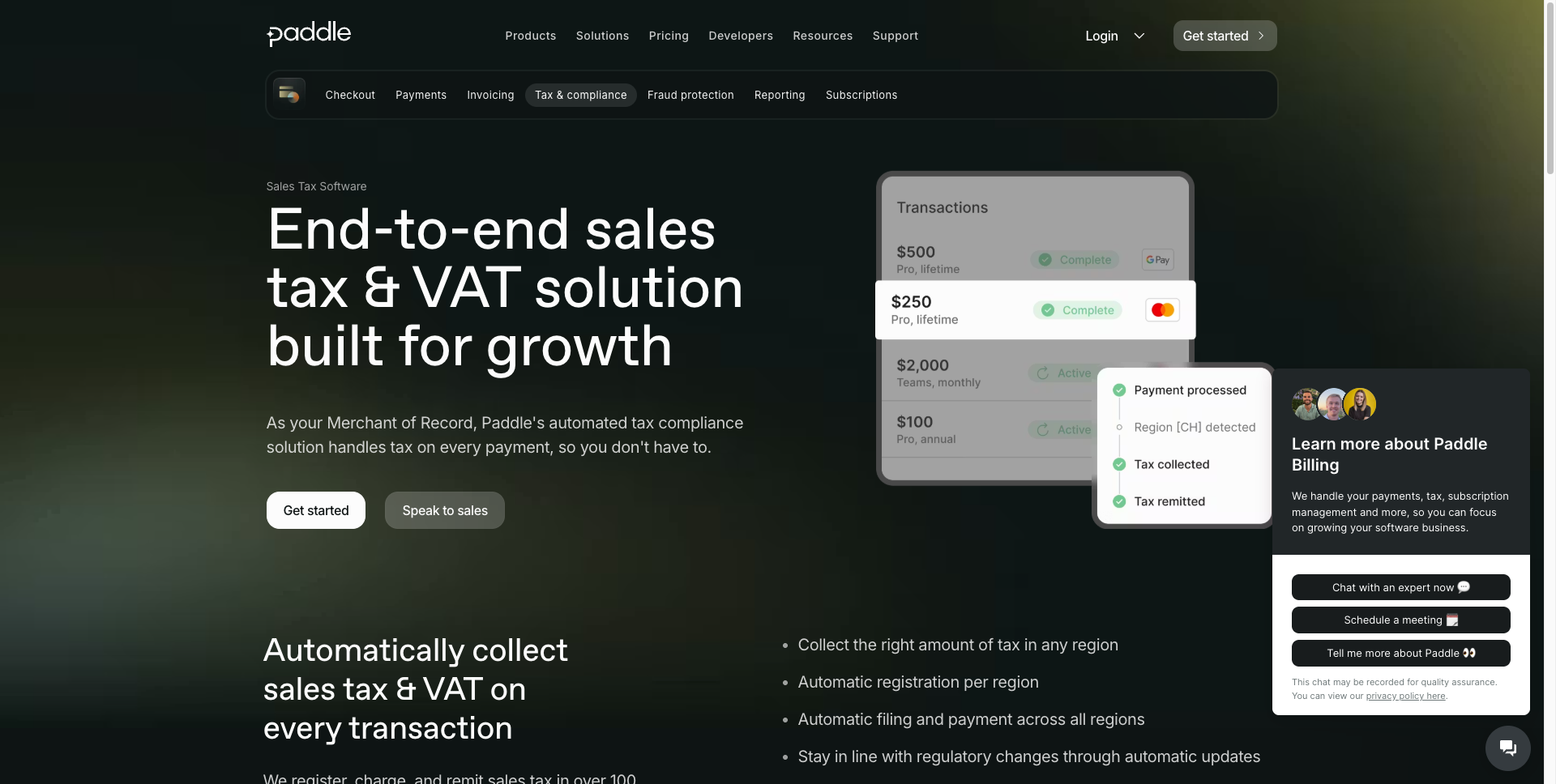 Paddle이 가장 강한 영역이다. 미국 50개 주 판매세, EU 27개국 VAT, 캐나다 GST/HST, 호주 GST, 인도 GST — 200개국의 세금 계산, 징수, 신고, 납부를 Paddle이 전담한다.