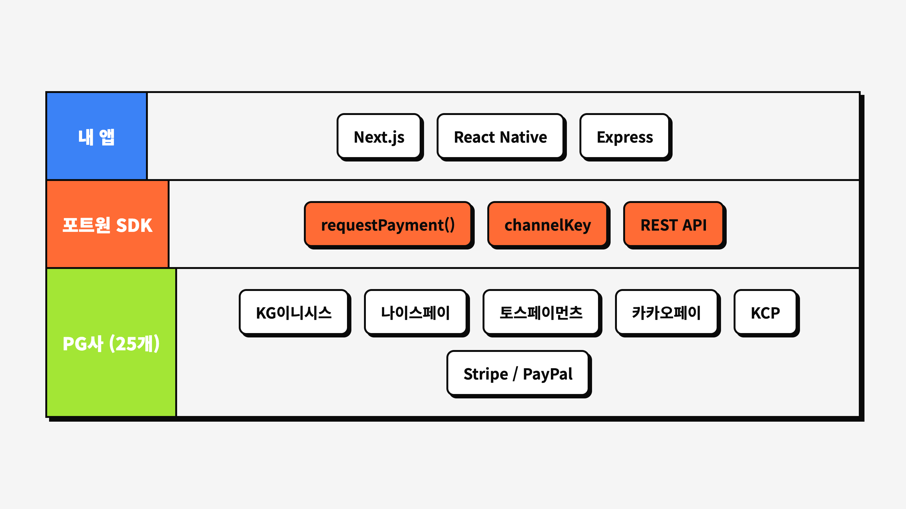 - 포트원은 국내 25개 PG사를 단일 SDK로 연동하는 결제 미들웨어다 — 카카오페이, 토스, KG이니시스 전부 코드 한 줄