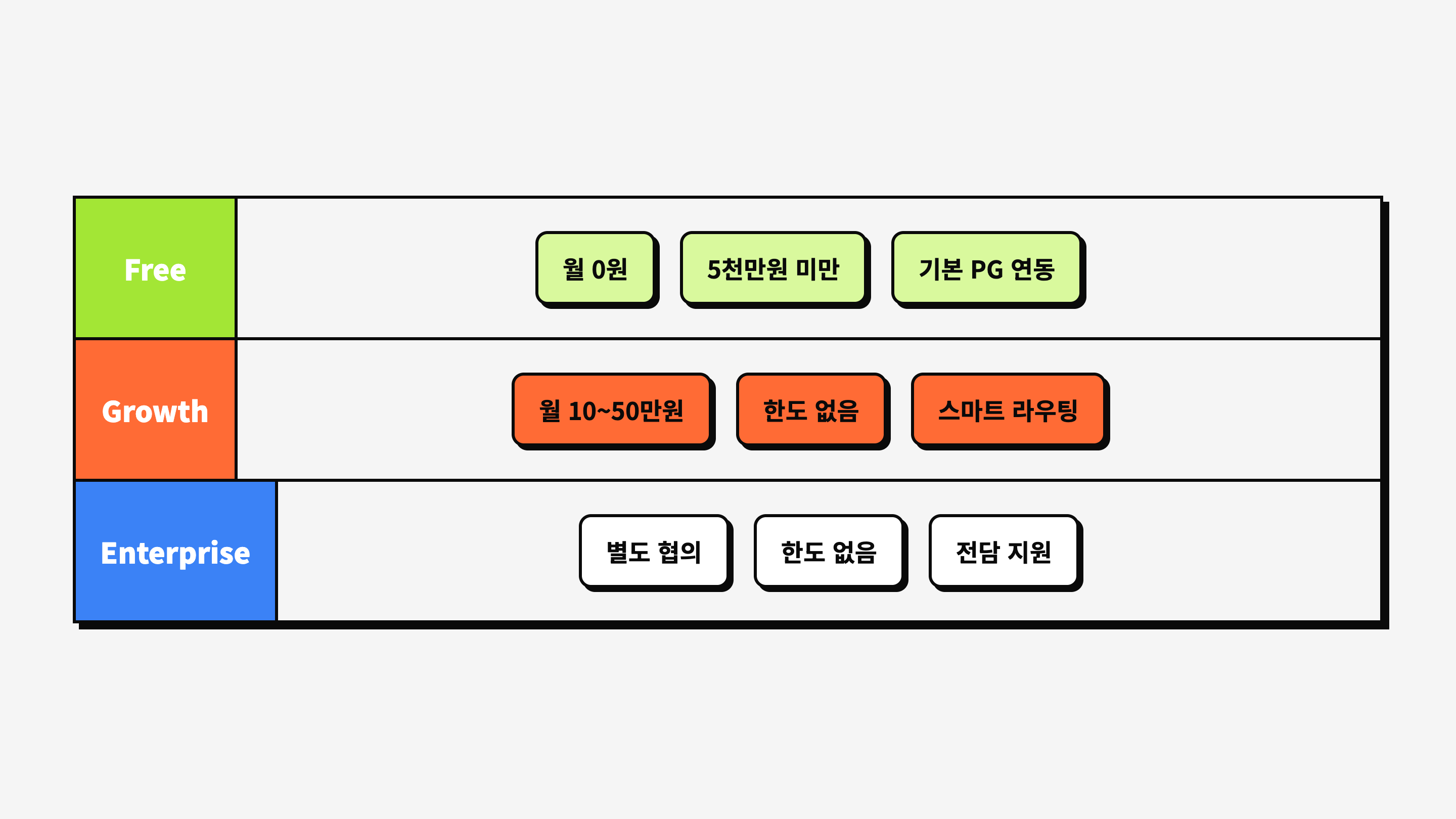 | Growth | 10~50만 원 | 제한 없음 | 스마트 라우팅, 파트너 정산, 우선 지원 |