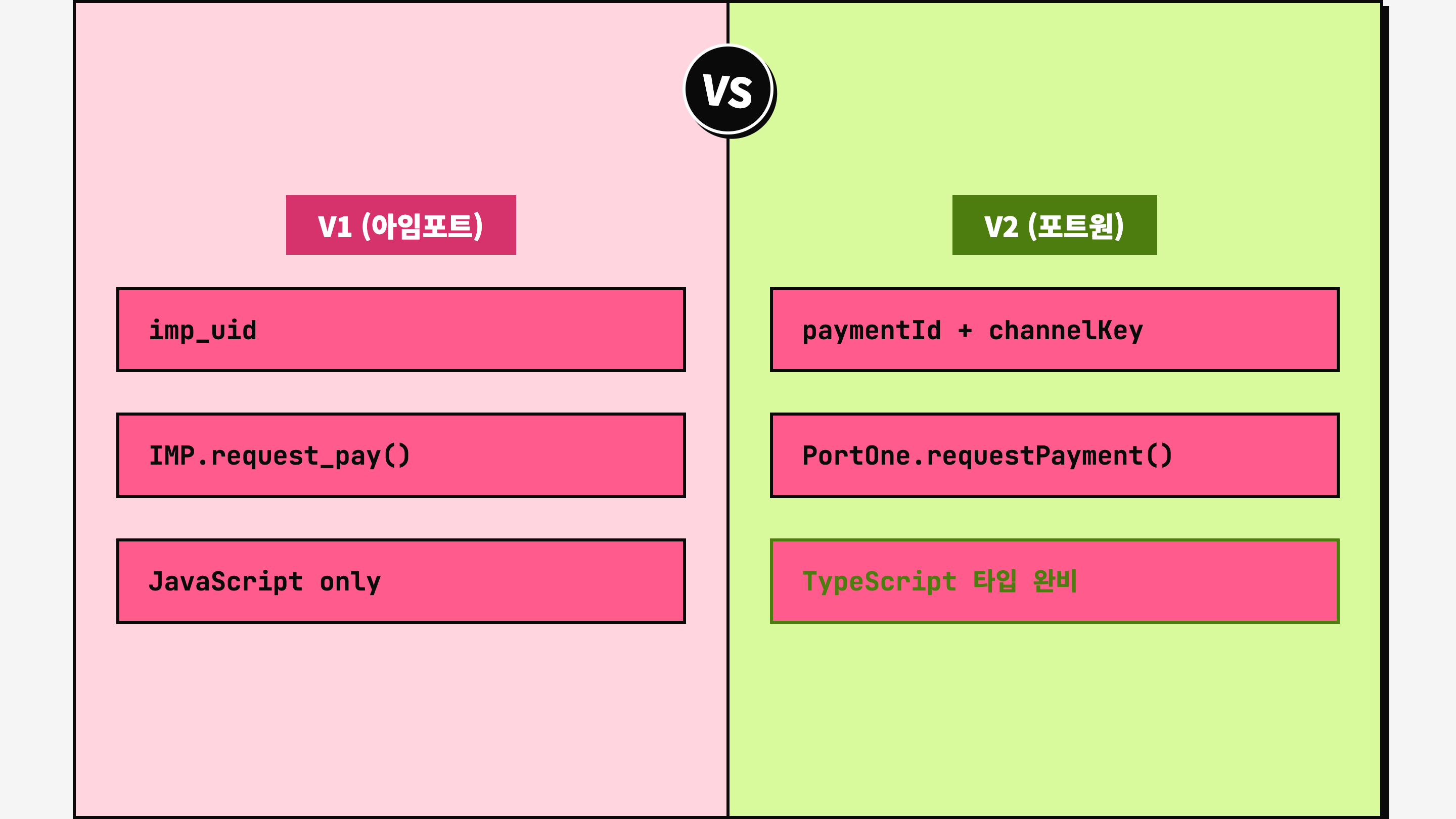 V1은 IMP.request_pay()처럼 JavaScript 함수 호출 방식이었다. V2는 REST API + channelKey 기반으로 완전히 재설계됐다.