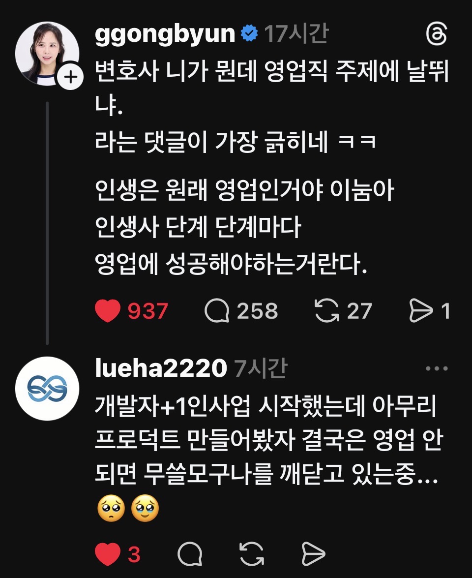 변호사가 쓴 글입니다. 댓글에 "변호사가 뭔데 영업직 주제에 날뛰냐"라는 반응이 달렸다고 합니다.