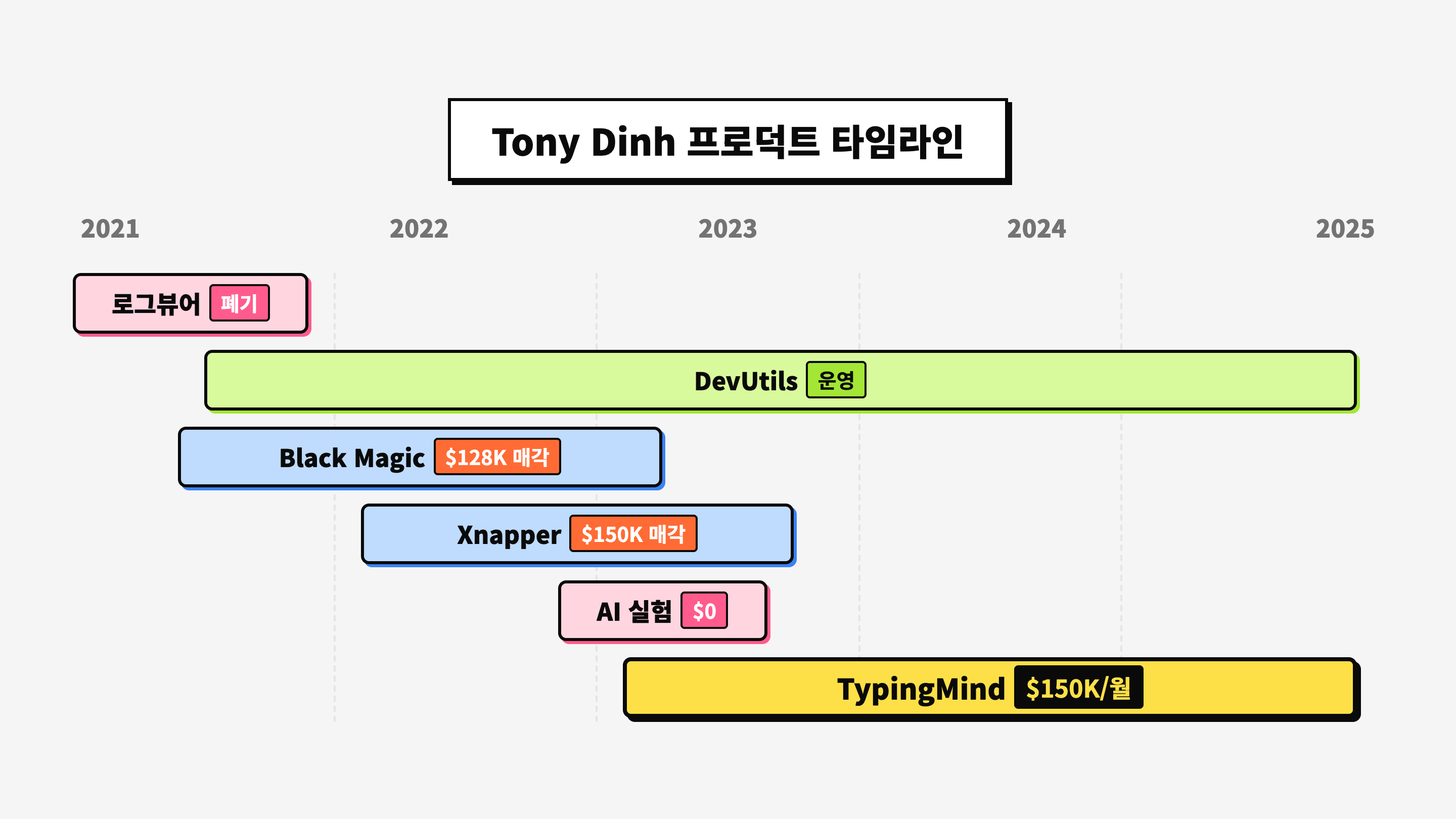 Tony는 여러 제품을 만들었고, 두 번의 매각으로 총 $278K를 회수했습니다. 현재 주력은 TypingMind입니다.