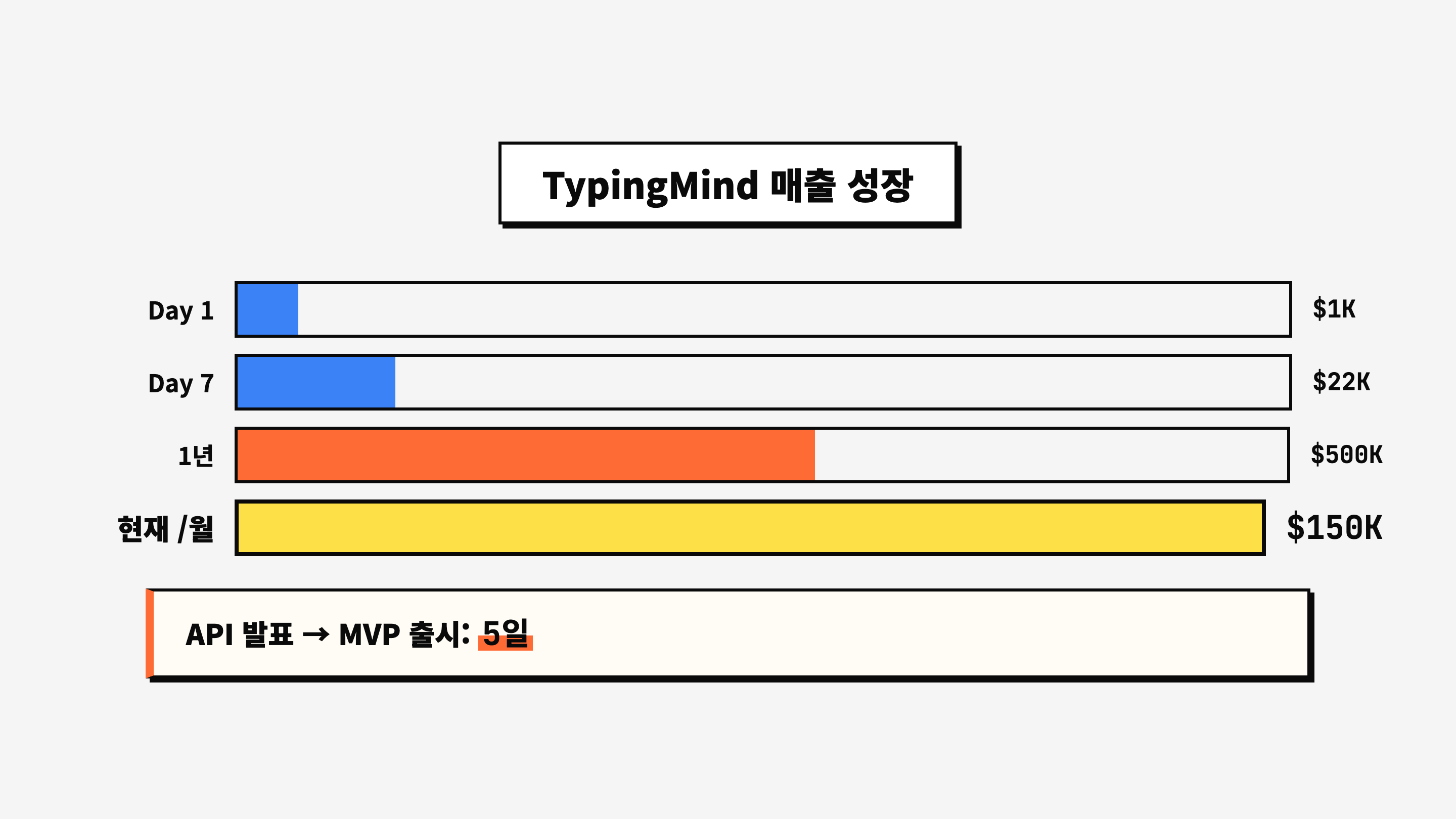 - TypingMind은 ChatGPT API 발표 후 5일 만에 MVP를 출시해 7일 만에 $22.7K, 1년 만에 누적 $500K를 넘겼고, 2025년 10월 기준 월 $130~160K를 공개했습니다.